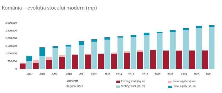 Chiar și așa, piața românească a ajuns la un stoc total de 4,1 milioane mp, susținută în ultimii ani de livrările de parcuri de retail, preferate celortalte formate, datorită accesului din exterior în magazine, considerat mai sigur în pandemie.