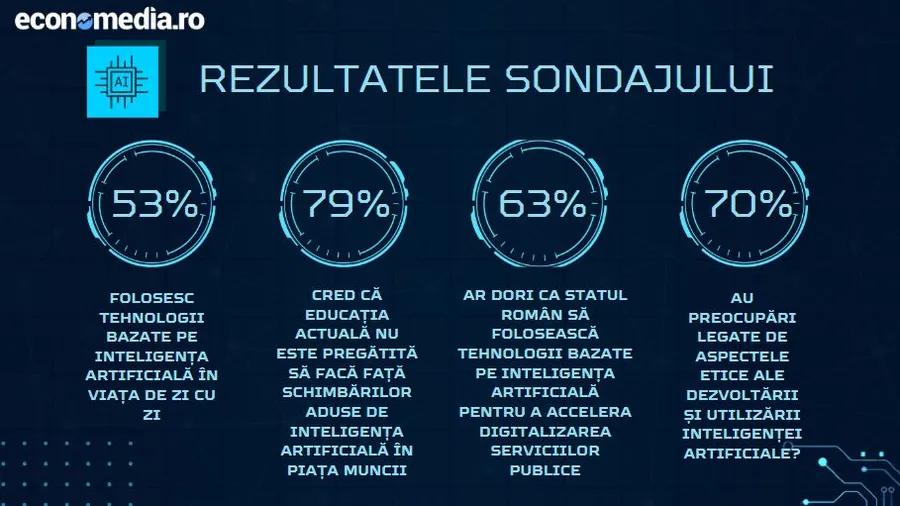 Conform unui sondaj realizat în mediul online printre cititorii Economedia, 53% dintre respondenți folosesc tehnologii bazate pe IA în viața de zi cu zi și 79% cred că sistemul actual de educație nu este pregătită să facă față schimbărilor aduse de IA pe piața muncii.