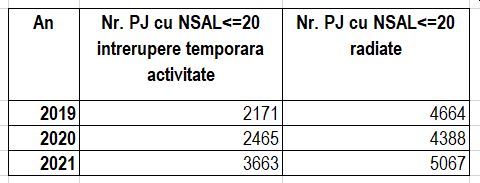 În ultimii ani, numărul firmelor cu mai puțin de 20 de angajați care și-au întrerupt temporar activitatea a crescut continuu: de la 2171 în 2019, la 2465 în 2020 și la peste 3600 anul trecut, arată datele centralizate pentru Economedia de Oficiul Național al Registrului Comerțului (ONRC). De asemenea, numărul firmelor radiate a trecut în 2021 de 5000, după ce în 2020 se înregistrase o ușoară scădere față de anul precedent.