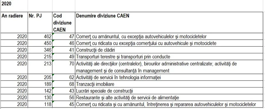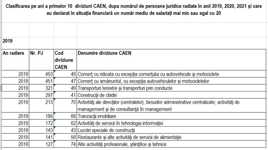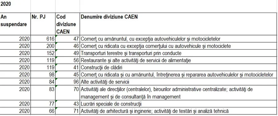 Vă prezentăm, mai jos, felul în care au evoluat cifrele privind numărul de firme radiate sau suspendate, trei ani la rând, și domeniile cele mai afectate. Sunt luate în calcul persoane juridice care au declarat în situația financiară un număr mediu de salariați mai mic sau egal cu 20.