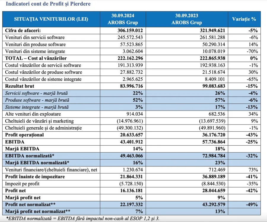 Astfel, AROBS Transilvania Software raportează o cifră de afaceri de 306,2 milioane de lei la nivel consolidat la 30 septembrie 2024, EBITDA de 43,4 milioane de lei și un profit net de 16,1 milioane de lei.
