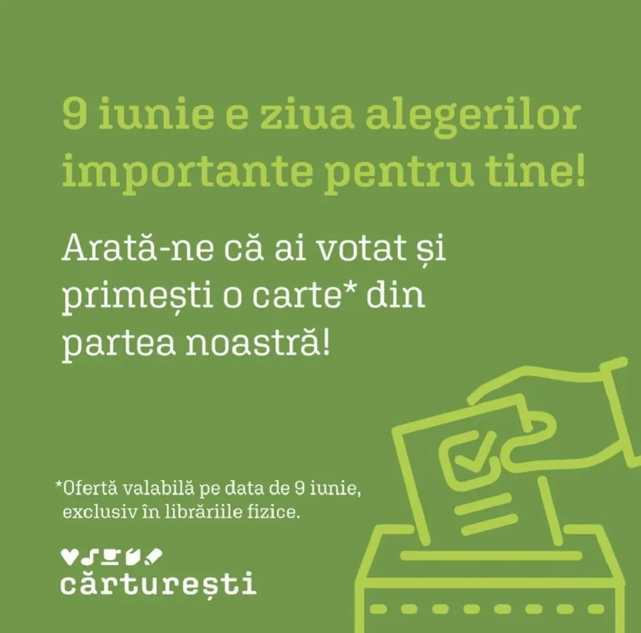 Librăriile Cărturești dăruiesc o carte oricărui cetățean care arată buletinul cu mențiunea „VOTAT 2024” la casa de marcat din orice librarie Cărturești. „Ofertă valabilă pe data de 9 iunie, exclusiv în librăriile fizice, în limita stocului disponibil”, conform mesajului citat.