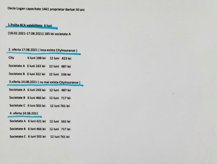 Un alt exemplu. În aprilie acest an, un român a dat pe o poliţă RCA pe 6 luni 195 de lei, la City. În octombrie, a fost nevoit să scoată din buzunar 496 de lei pentru o poliţă RCA pe 6 luni la o altă companie.