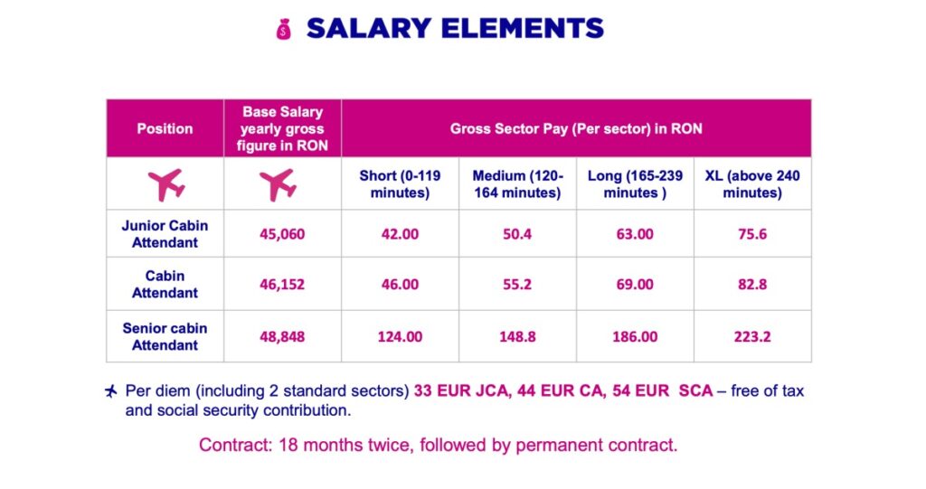 Compania aeriană low-cost Wizz Air caută să angajeze circa 100 de însoțitori de zbor în România și lansează un calendar privind recrutările din România. Cel mai mic salariu brut începe de la 45.060 lei pe an (3.655 lei pe lună) și poate ajunge și la 48.848 lei pe an (4.080 lei pe lună) pentru însoțitorii de zbor mai experimentați. La aceste salarii se adaugă și o serie de bonusuri în funcție de orele zburate și destinațiile parcurse.