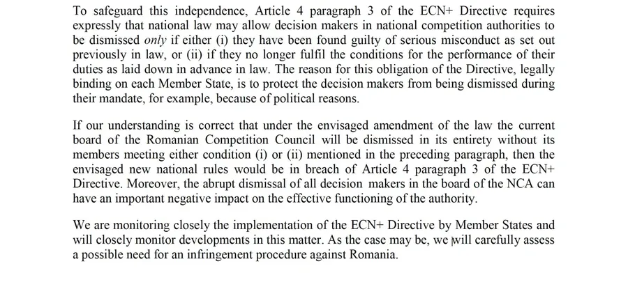„Comisia Juridică şi Comisia de Industrii din Camera Deputaţilor au adoptat luni, 19 decembrie 2022, mai multe amendamente la Legea Concurenţei care au atras din nou atenţia Comisiei Europene. Printre acestea se numără politizarea instituţiei prin numirea membrilor Consiliului Concurenţei de către Parlament. Un alt amendament adoptat vizează creşterea numărului demnitarilor Consiliului Concurenţei, de la 7 la 11, ceea ce va permite partidelor să îşi plaseze membrii în funcţii cheie pentru a răspunde comenzilor politice. Iar dacă legea Concurenţei se modifică cum vrea Parlamentul, România riscă infringement”, se arată în scrisoarea respectivă.