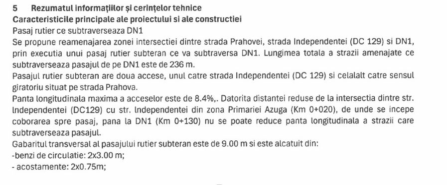 Pasajul rutier subteran de la Azuga are un cost estimat de 26 milioane lei (cu 8 milioane lei suplimentar față de licitația din 2024), iar durata de execuție este de 12 luni, conform documentației pe care a consultat-o Economedia. ,,Urmare a prezentei proceduri se urmarește realizarea obiectivului de investiții:Execuție lucrări pentru obiectivul de investiție: ”Realizare pasaj rutier la intersecția DN1 cu strada Prahovei” (AZUGA). Se propune reamenajarea zonei intersectiei dintre strada Prahovei, strada lndependentei (DC 129) si DN1, prin executia unui pasaj rutier subteran ce va subtraversa DN1. Lungimea totala a strazii amenajate ce subtraverseaza pasajul de pe DN1 este de 236 m. Pasajul rutier subteran are doua accese, unul catre strada lndependentei (DC 129) și celalalt catre sensul giratoriu situat pe strada Prahova.”-SEAP.