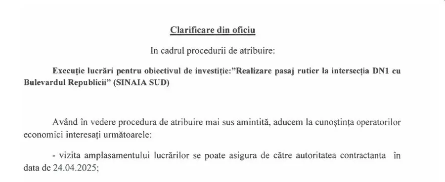 Urmare a prezentei proceduri se urmarește realizarea obiectivului de investiții: ”Realizare pasaj rutier la intersecția DN1 cu Bulevardul Republicii” (SINAIA SUD). În prezent traficul rutier în interiorul oraşului Sinaia se realizeaza cu dificultate datorită numărului mare de autovehicule ce tranzitează DN 1 prin interiorul oraşului, dar si a trecerilor de pietoni si a traficului local aferent strazilor care converg in DN 1, ceea ce conduce la timpi mari de aşteptare in coloanele care se formeaza datorita staționarii îndelungate a autovehiculelor in interiorul orasului, consum sporit de carburant, poluare fonica si emisii crescute de noxe.