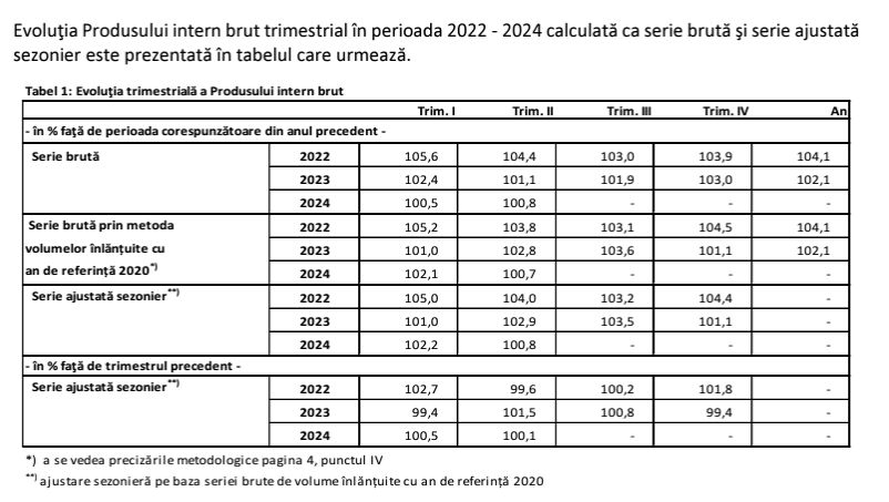 INS notează că seria ajustată sezonier a Produsului intern brut trimestrial nu s-a modificat semnificativ ca urmare a revizuirii estimărilor pentru trimestrul II 2024 în această primă variantă provizorie faţă de varianta „semnal” publicată în 14 august 2024.