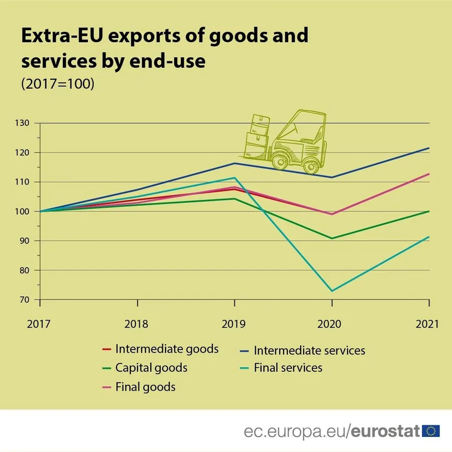 Exporturile de servicii finale au fost cele mai afectate, cu o scădere de 38 de puncte procentuale (pp) față de nivelurile din 2019, din cauza prăbușirii poziției de călătorie (cheltuieli ale turiștilor și călătorilor străini). Deși au crescut din nou, exporturile de servicii finale, precum și exporturile de bunuri de capital, nu au revenit încă la nivelurile anterioare pandemiei.