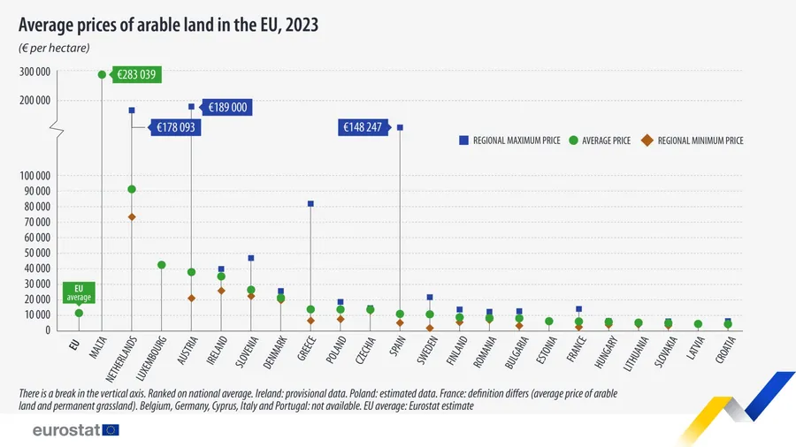 În rândul celor 22 de ţări pentru care sunt disponibile datele, cel mai ridicat preţ mediu pentru un hectar de teren arabil se înregistra în Malta: 283.039 euro pe hectar. Următoarele cele mai ridicate preţuri medii erau în Ţările de Jos: 91.154 euro pe hectar, şi Luxemburg: 42.540 euro pe hectar. În contrast, cele mai scăzute preţuri medii erau în Croaţia: 4.491 euro pe hectar, Letonia: 4.591 euro pe hectar şi Slovacia: 5.189 euro pe hectar.