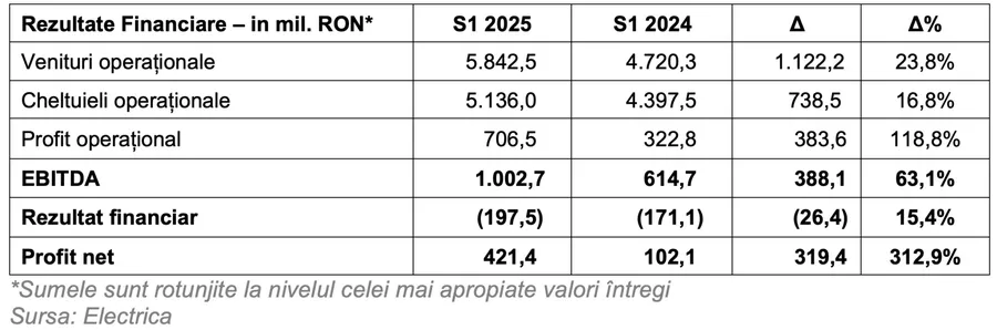 Grupul Electrica a înregistrat un profit net de 421,4 milioane de lei, în primul semestru din 2025, în creştere de la 102,1 milioane de lei, în aceeaşi perioadă din anul anterior, conform raportului financiar al companiei..