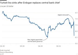Anunțul surprinzător de vineri seara, de demitere a celui ce a readus încrederea în instituția ce guvernează politica monetară din Turcia a reversat, într-o clipă, o parte mare din eforturile anterioare: lira s-a depreciat instant luni dimineața la deschiderea piețelor, cu nu mai puțin de 15%. Încrederea greu câștigată fusese din nou, brusc, pierdută. Odată cu deschiderea piețelor europene deprecierea s-a mai temperat, însă rămâne semnificativa, de aproximativ 10%. Într-o singură zi. Investitorii, care au aplaudat deciziile oficialului de a reveni către politici monetare convenționale au fost luați prin surprindere. Piețele calme sunt o amintire acum.