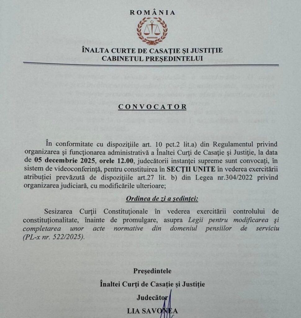 „În conformitate cu dispozițiile art. 10 pct.2 lit,a) din Regulamentul privind organizarea şi funcţionarea administrativă a Înaltei Curți de Casaţie şi Justiţie, la data de 05 decembrie 2025, orele 12.00, judecătorii instanței supreme sunt convocați, în sistem de videoconferință, pentru constituirea în SECȚII UNITE în vederea exercitării atribuţiei prevăzută de dispozițiile art.27 lit. b) din Legea nr.304/2022 privind organizarea judiciară, cu modificările ulterioare;
