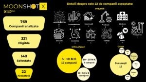 Din perspectiva cifrei de afaceri, dintre cele 22 de companii românești care vor lua parte la MoonShotX, 13 au cifră de afaceri între 5 și 10 milioane de euro, 6 între 10 și 20 de milioane de euro și 3 între 20 și 50 de milioane de euro. La nivel de industrii și arii de activitate, 7 companii activează în industria IT, 3 în Producție, 2 în Construcții, 2 în Sustenabilitate, 2 în Retail, iar celelalte 6 companii din Sănătate, Educație, Transporturi, Cosmetice, Utilități și Peisagistică. Din punct de vedere demografic, 13 companii provin din București, 2 din Cluj, 2 din Timișoara, 2 din Brașov, 1 din Iași, 1 din Alba și 1 din Oradea.