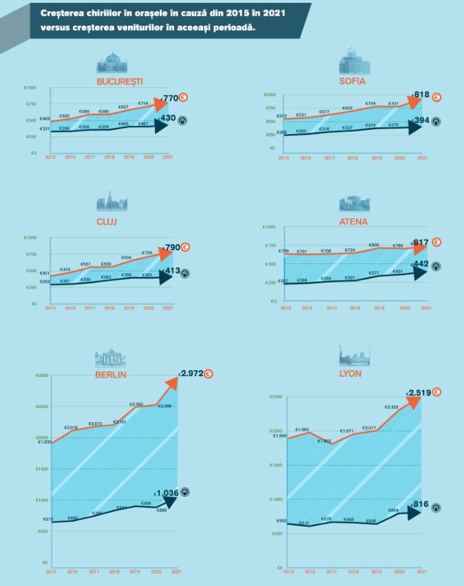 Conform raportului, din 2015 până în 2021, chiriile au crescut cu cel puțin 30% în București și cu cel puțin 40% în Cluj, iar în alte orașe europene creșterile au fost uneori chiar mai mari.