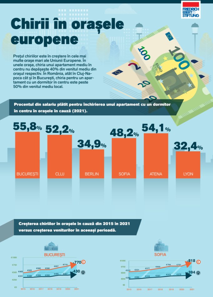 Prețul chiriilor este în creștere în cele mai multe orașe mari ale UE. În unele orașe, chiria unui apartament mediu în centru nu depășește 40% din venitul mediu din orașul respectiv. Însă, în România, atât în Cluj-Napoca cât și în București, chiria pentru un apartament cu un dormitor în centru este peste 50% din venitul mediu local, potrivit raportului Monitorului Social, al Fundației Friedrich Ebert