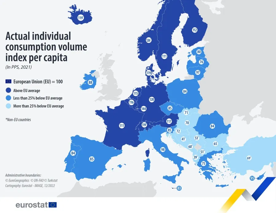 În anul 2021, consumul individual efectiv (AIC) per capita varia între 65% din media UE în Bulgaria şi 144% din media UE în Luxemburg. Nouă state membre UE au avut un consum per capita mai mare decât media din UE în 2019 şi restul de 18 state membre au fost sub media din UE.