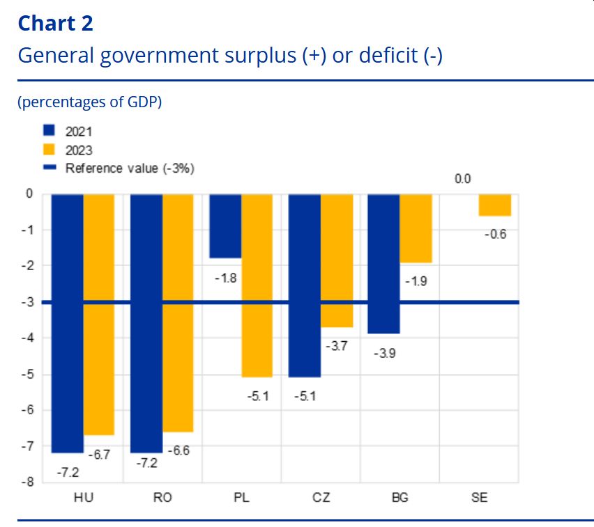 România face în prezent obiectul unei proceduri de deficit excesiv, iar Comisia Europeană a constatat, în iunie 2024, că aceasta nu a luat măsuri eficiente. Deficitul bugetar al administrației publice din România a fost de 6,6% în 2023, adică semnificativ peste valoarea de referință de 3%, în timp ce raportul datorie/PIB a fost de 48,8%, adică sub valoarea de referință de 60%.