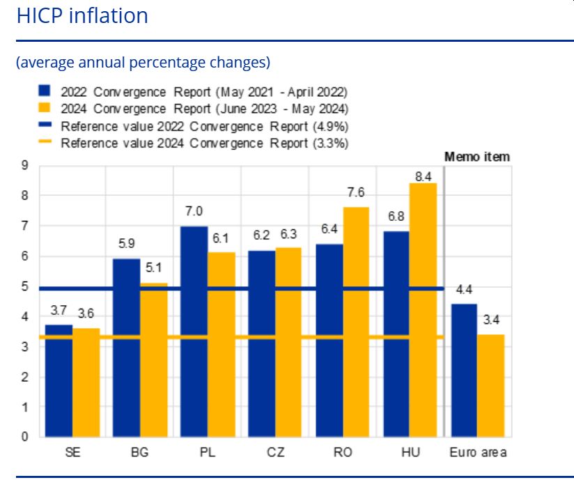 Raportul BCE arată că în luna mai 2024, rata medie pe 12 luni a inflației IAPC în România a fost de 7,6%, adică mult peste valoarea de referință de 3,3% pentru criteriul privind stabilitatea prețurilor. Se preconizează că această rată va scădea treptat în următoarele luni, datorită înăspririi politicii monetare din trecut și a scăderii presiunilor legate de blocajele în aprovizionare.