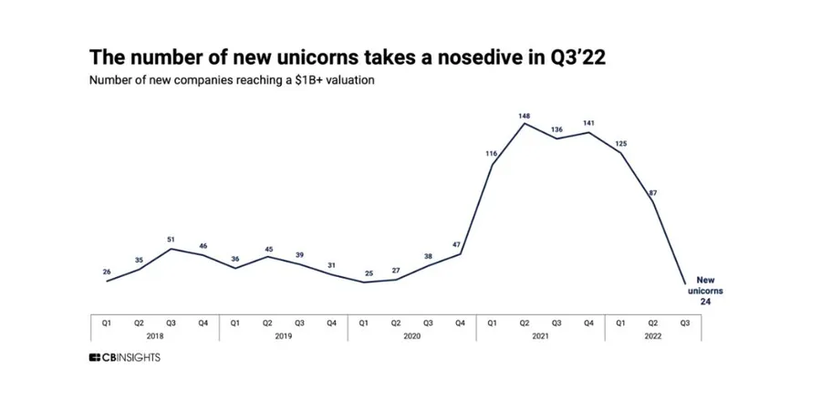Numărul de nașteri de noi unicorni a scăzut timp de 3 trimestre consecutive, doar 24 de startup-uri atingând pragul de peste 1 miliard de dolari în T3’22 – cea mai mică cifră trimestrială de la începutul anului 2020.